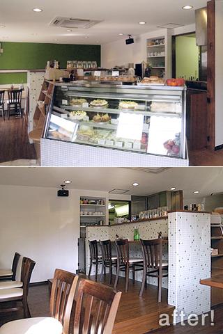 もともとケーキ屋さんだったテナントを、新規にオープンするケーキ屋さんとして改修。既存の家具や機器を使用する意向と、イメージチェンジをご要望の若手パティシエ。動線と水廻り部分をガラっとかえることにより、愛らしいケーキ屋さんができあがりました。