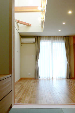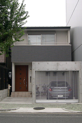 市街地にありがちな東西に長く、間口の小さい敷地。南側には背の高い建物が近接している。そのような条件のもと、光庭・吹抜け・天窓や高窓を設けることにより、光の広がりや風の流れを有効に確保した心地よい住まい。